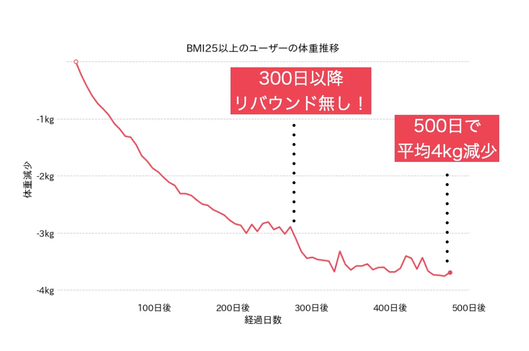 体重減少のペースも初期10日間に急激に減少し、その後は緩やかになりました。これは、心理的に厳しい時期を経て、根本的な生活習慣が変わり、持続可能な体重管理が可能になっていることを示しています。300日を過ぎると体重の変動幅が少なく、リバウンドが見られない状況にまで至ることが確認されました。