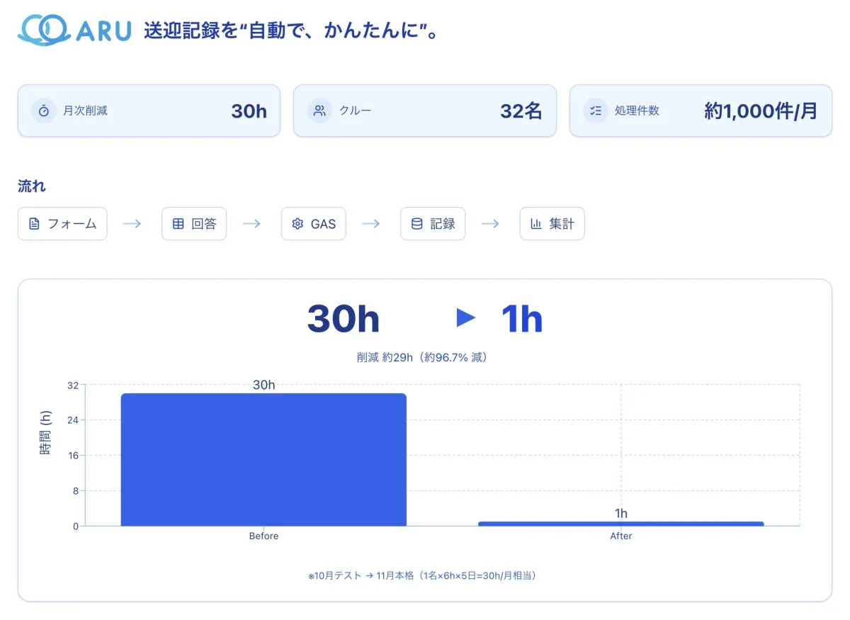 福祉の現場では「人が足りない」「時間がない」という言葉が頻繁に聞かれます。特に書類や記録、集計作業がサービスの提供を妨げているのが現実です。株式会社ARUでは、月に約1,000件の送迎記録を管理側が手作業で集計しており、これが少人数での業務を圧迫していました。業務に必要な時間は月に30時間にも上り、その膨大な時間を何とか短縮する方法が求められていました。