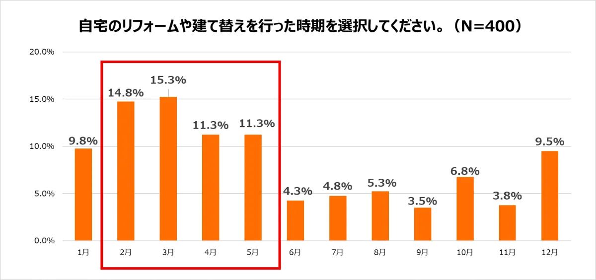 調査によると、自宅のリフォームや建て替えを行う人々は、主に3月に集中していることがわかりました。特に、年度末の新生活がスタートするこの時期に、リフォームや建て替えが多く行われています。3月は15.3%、続いて2月が14.8%と、春に向けての新たな生活に向けた動きが影響しているようです。この傾向は、家族や環境が変わるタイミングに関わっており、引っ越しシーズンと相まって特に顕著です。