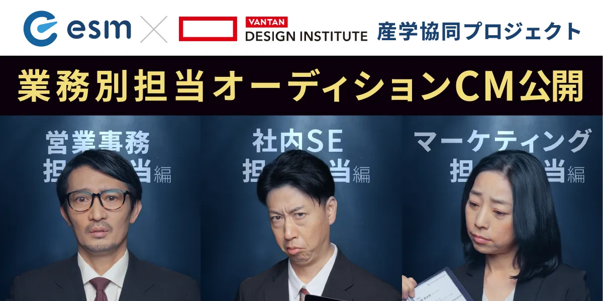 公開されたCMでは、バンタンデザイン研究所の生徒が構想から撮影・編集までを担当しました。内容は、スーツ姿の会社員が、日常ではあり得ない業務担当者のオーディションに参加するという驚きの設定。応募者たちは、名刺の整理や旧式の業務を自らの特技としてアピールしますが、審査員からの鋭い指摘により、今や「esmシリーズ」が必須であることを示唆されます。このように、旧来の業務方法が効率化できることを訴求しています。