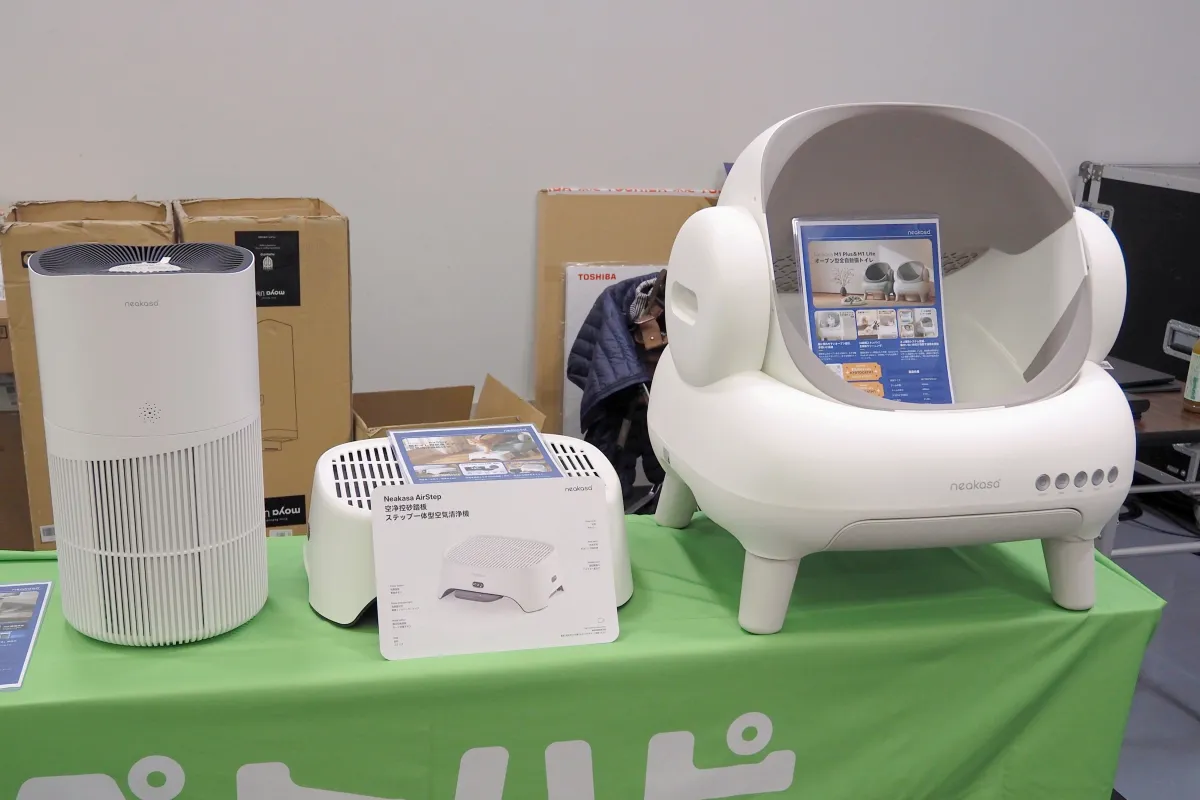 Neakasaのブースでは、同社の主力製品である全自動猫トイレ「M1」をはじめ、空気清浄機能付き猫砂ステップ「AirStep」、さらにはペット向け空気清浄機「A1 Pro」などが展示され、来場者はそれらを実際に体験することができました。それぞれの製品は、ペットとの快適な生活をサポートするために開発されており、多くの関心を集めました。