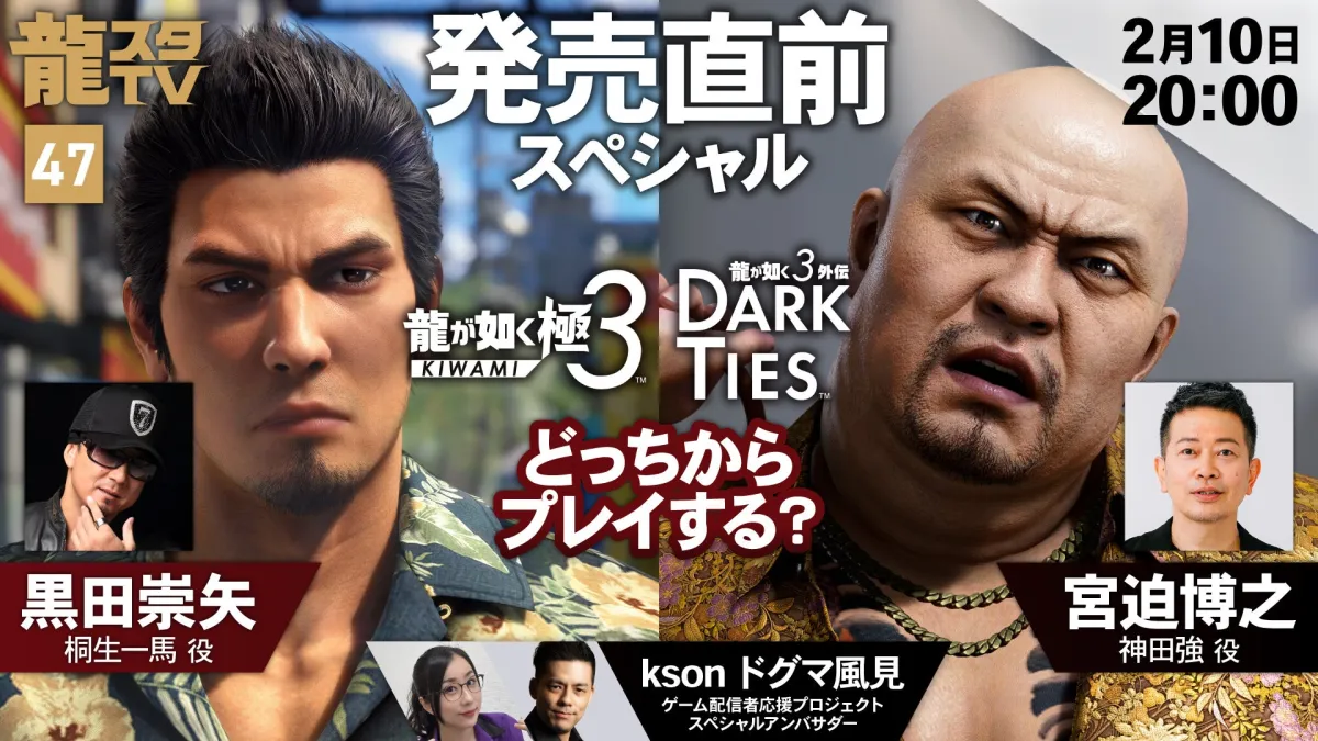 2026年2月10日(火)20:00から、YouTube Liveとニコニコ生放送で放送される「龍スタTV#47」では、人気ゲームシリーズ『龍が如く』の最新作『龍が如く 極3』の発売を前にした特別な内容が展開されます。
