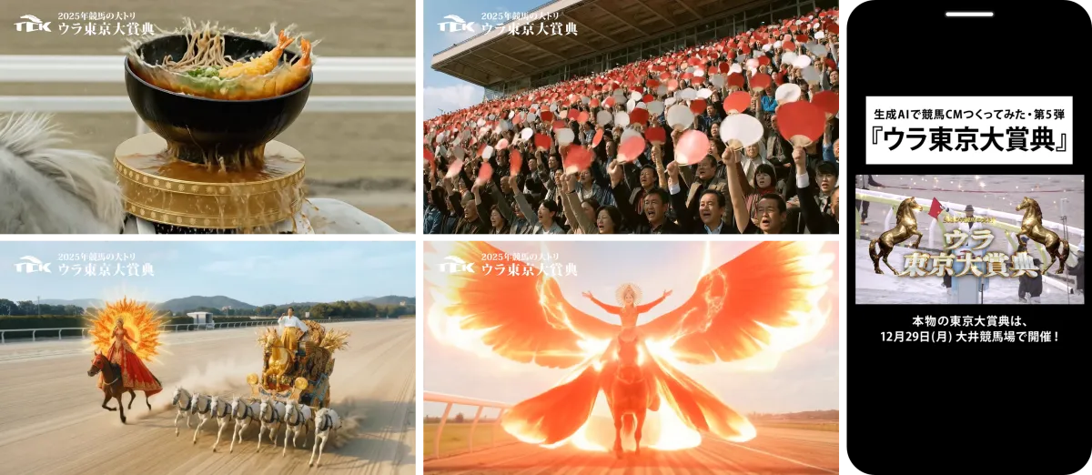 このように、TCKが手掛ける『ウラ東京大賞典』は、生成AIによる新しいアイデアや映像表現の可能性を探る挑戦でありながら、競馬の楽しみ方を広げる魅力的なプロジェクトです。競馬ファンはもちろん、幅広い層の観客に楽しんでもらえる内容となっています。特別な年末の盛り上がりをぜひ体験してください。