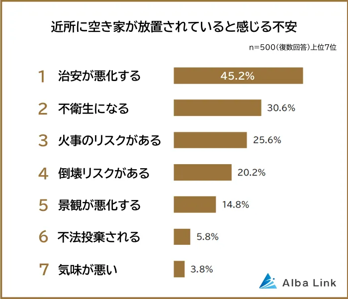 近年、増加している空き家問題に対して、近隣住民はどのような不安を抱えているのでしょうか。株式会社AlbaLinkが全国の男女500人を対象に実施した「空き家の放置で感じる不安に関する意識調査」の結果を元に、主な不安要素や解決策について考察します。