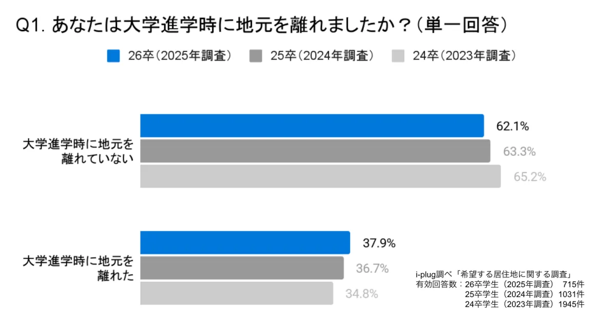 調査によると、62.1%の26卒学生は大学進学時に地元を離れていないという結果が出ました。前年の結果では65.2%であったため、地元を離れた割合は若干減少しています。一方で、地元を離れた学生の中で「いずれは地元に戻りたい」と考えているのは35.8%に上ります。すぐにでも戻りたいとの回答を合わせると、46.5%となり、昨年の40.2%から大きく増加していることが分かります。