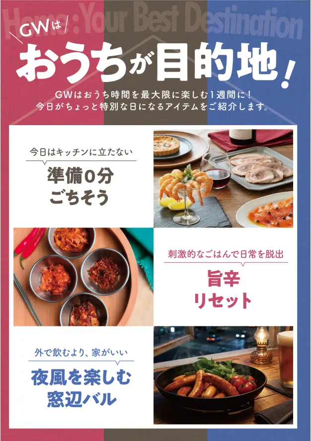 成城石井では、4月24日より「GWはおうちが目的地!」というリーフレットを配布し、自宅で楽しめる美食のシーンを紹介します。それぞれのシーンに合った商品が掲載されており、ユーザーはいつでも成城石井の味を楽しみながら、特別な時間を過ごせます。