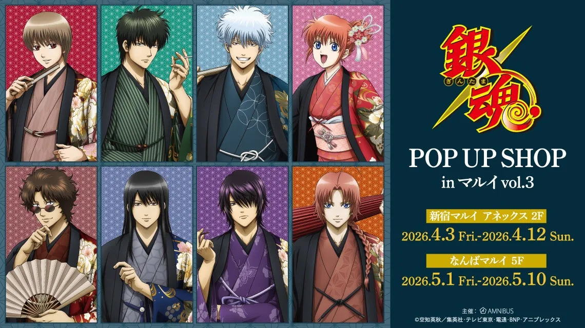 株式会社アルマビアンカによる「TVアニメ『銀魂』POP UP SHOP in マルイ」の第3弾が、2026年の4月3日から新宿マルイ アネックスで始まり、続いて5月1日からなんばマルイで開催されることが発表されました。このイベントは「片面花柄和装」をテーマにした新しい描き下ろしイラストを使った商品が数多く登場し、ファンにとって楽しみな企画が目白押しです。