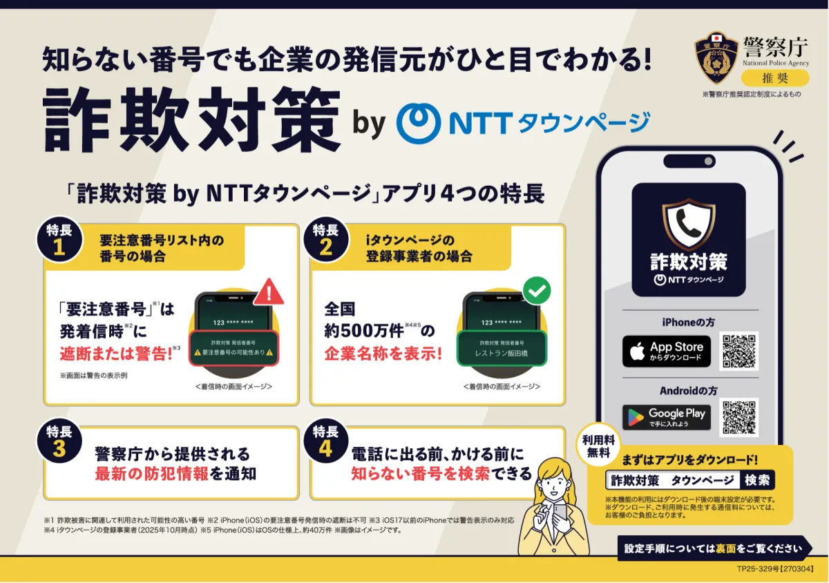 トビラシステムズ株式会社(名古屋市)とNTTタウンページ株式会社(東京・中野区)は、連携して特殊詐欺対策を目的としたアプリ「詐欺対策 by NTTタウンページ」を開発し、警察庁推奨制度認定を受けました。このアプリは2026年3月5日から無料で提供される予定です。