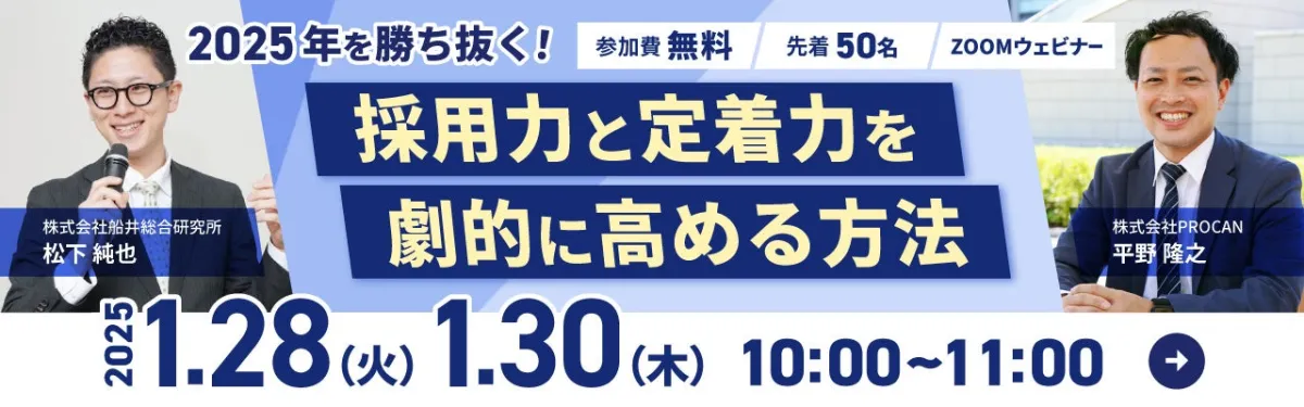 ウェビナーでは、業界の専門家が最新のトレンドや成功事例を紹介し、効果的な人材採用と定着戦略について解説します。前半では船井総合研究所が“人が集まる会社”と“隊員が減少し続ける会社”の違いについて、そして採用と育成がうまくいっている企業の秘密を明かします。後半ではPROCANから、現役隊員の意識調査結果を踏まえて働きたい会社の条件や、成功事例を通して人材定着のためのシステムを紹介します。