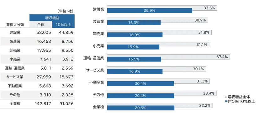 2024年度の増収増益企業数は14.2万社に達し、全体の32.2%を占めています。特に建設業が目立ち、公共工事や半導体関連の新設工場、都市の再開発がさらに業績を押し上げました。上記の要因から、増収増益率が10%以上の企業は全体の20.5%にのぼります。