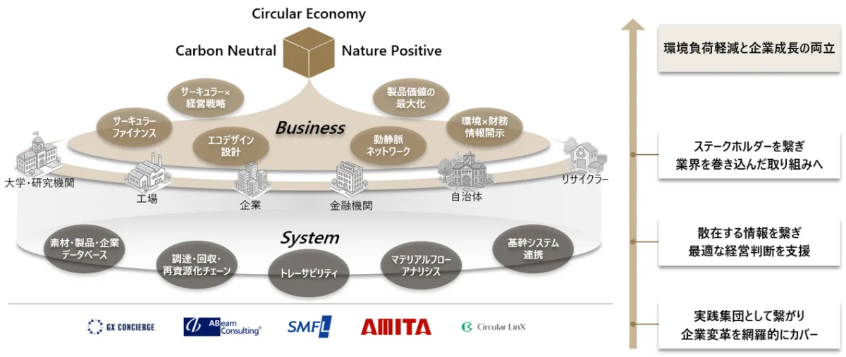 業界のさまざまな情報を集約し、企業のCEへの移行を実現するため、専門家集団としての役割を果たします。環境負荷の軽減と企業の成長を両立させるための新たなアプローチです。