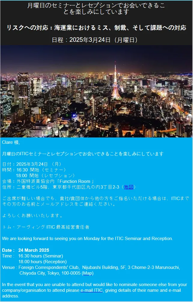 2023年3月24日(水)、英国に拠点を置く国際輸送仲介クラブ(ITIC)は、海運業に関連したリスク管理の重要性についてのセミナーを開催します。このセミナーは、外国特派員協会が中心となり実施される予定で、海運業界の専門家や関係者に向けた内容となっています。セミナーに先立つ形で、ITICのCEO、Tom Irving氏が記者会見を行うことが決定しました。