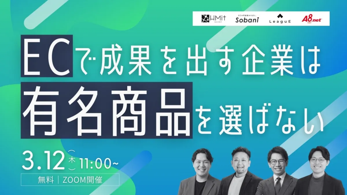 度重なる拡大を続けるEC市場。しかし、多くの企業が直面しているのが、思うように売上が伸び悩んでいる現実です。特に、名のあるブランドや商品が強力な競争力を発揮している現在、知名度がない商品にとっては厳しい状況が続いています。このような中、株式会社LeaguEを初めとする4社が力を合わせ、2026年3月12日(木)にオンラインセミナー『ECで成果を出す企業は「有名商品」を選ばない』を開催することとなりました。
