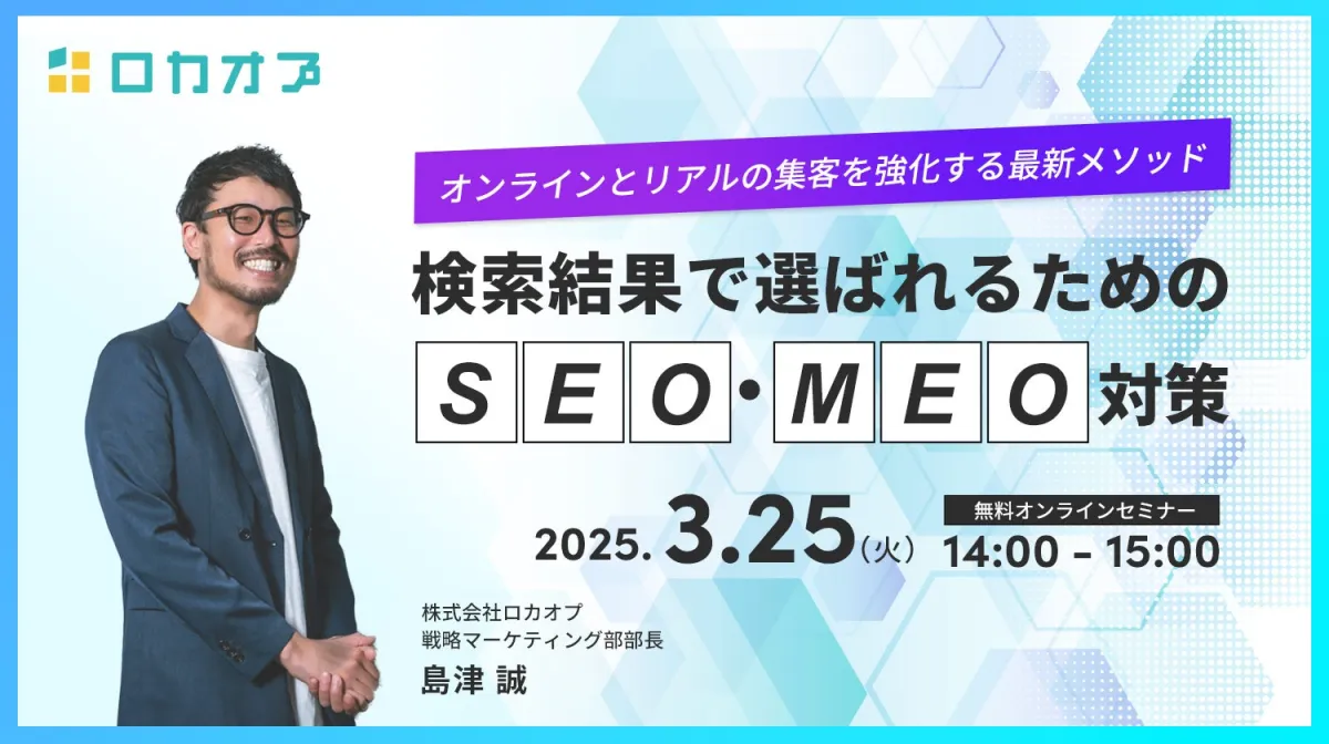 株式会社ロカオプ(所在地:東京都新宿区新宿)は、3月25日(火)午後2時より、無料のオンラインセミナー「検索結果で選ばれるためのSEO・MEO対策」を開催します。このセミナーでは、店舗やサービスをGoogle検索で見つけてもらうだけでなく、実際に選ばれるための施策を詳しく解説します。