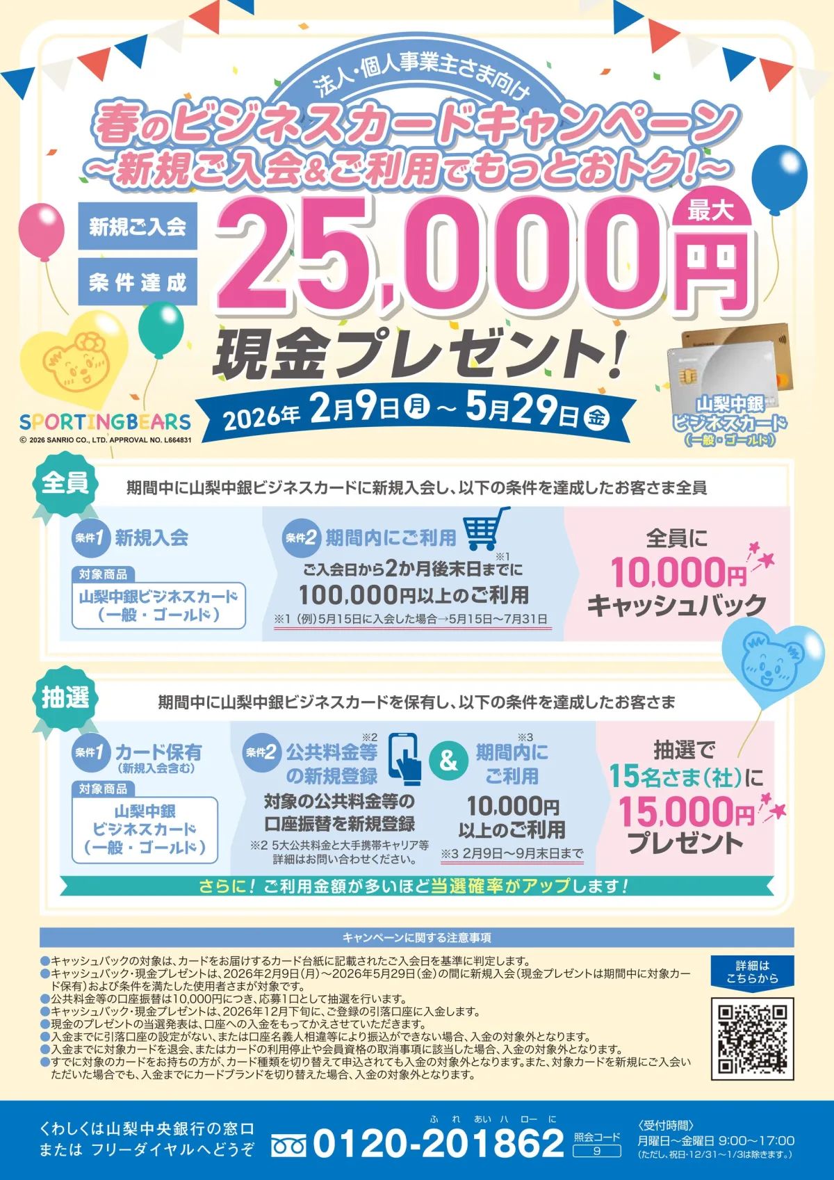 この春のキャンペーンを通じて、より多くの方に山梨中央銀行のビジネスカードの魅力を知っていただければ幸いです。新たなビジネスのパートナーとして、皆さまのご参加を心よりお待ちしております。