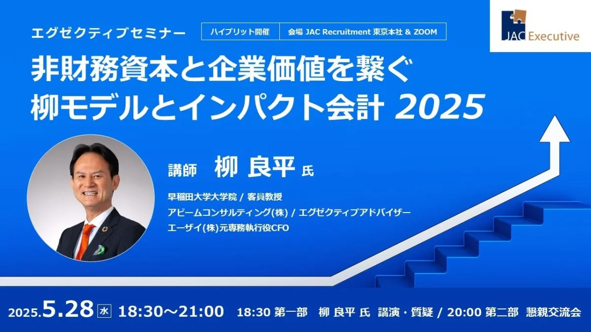 2025年5月28日(水)、株式会社ジェイ エイ シー リクルートメント(JACリクルートメント)が主催する『非財務資本と企業価値を繋ぐ柳モデルとインパクト会計 2025』が開催されます。本セミナーでは、元エーザイCFOで現在は早稲田大学の客員教授である柳良平氏が講師を務めます。昨年のセミナーも好評を博し、今回はその続編となる重要なイベントです。