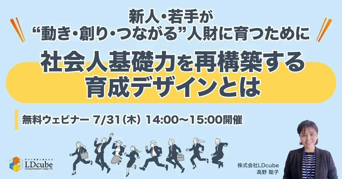 株式会社LDcubeは、企業向けの人材育成サービスを提供しており、新人や若手社員の成長を支援するための無料ウェビナーを2025年7月31日に開催します。このウェビナーのテーマは「新人・若手が“動き・創り・つながる”人財に育つために社会人基礎力を再構築する育成デザイン」です。