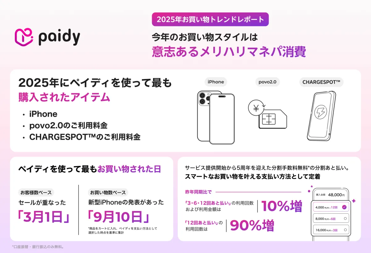 ペイディの提供する分割手数料無料の分割あと払いサービスは、特にこのトレンドにおいて重要な役割を果たしています。顧客はこのサービスを積極的に利用し、デジタルコンテンツや旅行へと投資を行っています。2025年のペイディユーザーによる購買データからも、利用回数とお買い物金額が前年比で10%増加していることがわかります。