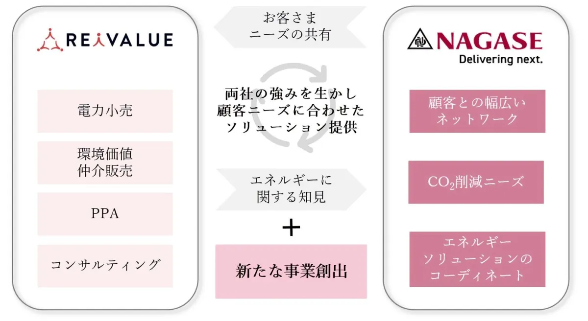 2025年中央、リアイバリュー株式会社は長瀬産業株式会社と資本業務提携契約を締結した。これは、CO₂削減とコスト削減の両立を実現するエネルギーソリューションの推進を狙ったもので、持続可能な社会の実現を目指している。