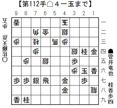 菅井八段が先手を取ったが、7手目に同じく先手の菅井流の指し方、▲8八銀を放つと、佐藤九段は最強の手法を駆使し、角交換で応じる。これにより、局面は一気に乱戦へと移行した。菅井八段は馬や角を巧みに使い、じっくりと駒を組み直していく傾向が見られたが、徐々に優位を築いた佐藤九段に押し返されていくことになる。