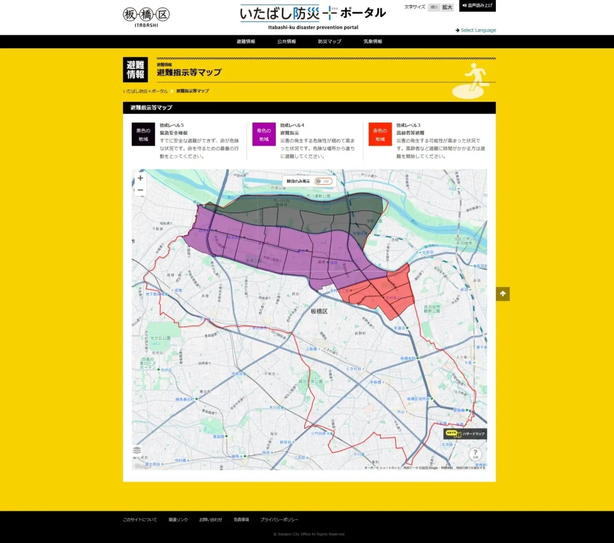 「いたばし防災+ポータル」では、災害発生時に必要な情報が整理されており、視覚的に分かりやすい表示を提供しています。トップページには、避難発令情報や避難所の開設状況などが地図上に表示されるほか、地区名や住所別に情報を探すことも可能です。これによって、多くの人が迷わず必要な情報にたどり着くことができます。