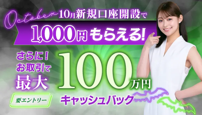 新しく口座を開設した方全員に、2025年11月14日16時00分までにキャンペーンへのエントリーを行うことで、キャッシュバックとして1,000円が戻ります。さらに、この期間中にFX取引の新規約定数量合計が10万通貨以上となると、最大で100万円のキャッシュバックを受けることができます。