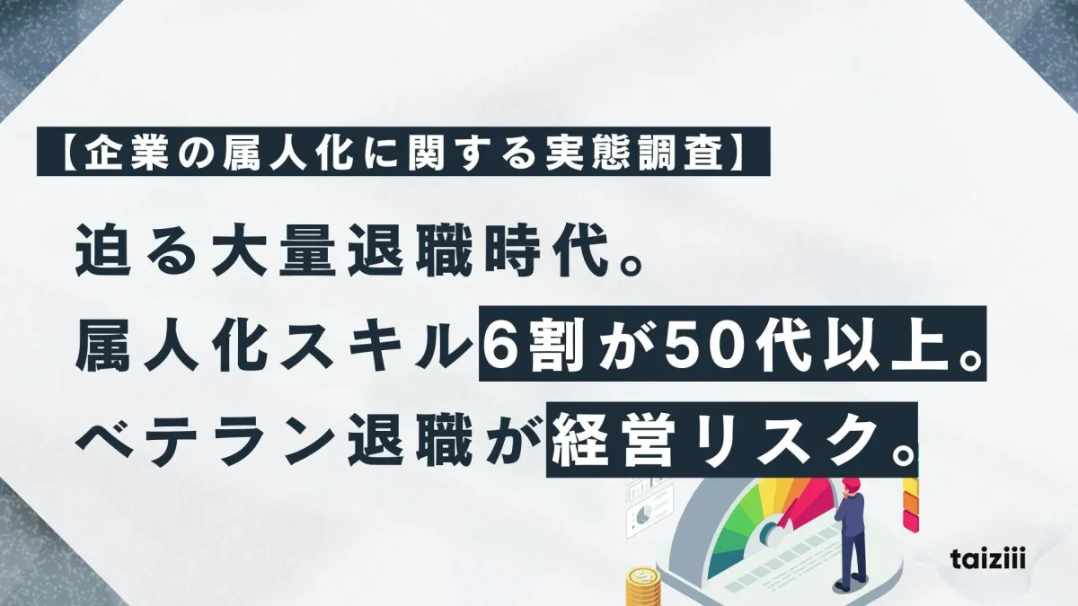 このような状況を背景に、株式会社taiziiiが実施した調査によると、実に60.28%の属人化スキルが50代以上の社員に集中していることが明らかになった。また、調査に参加した200名の管理職のうち、74.5%がベテラン社員の退職によるリスク感を抱いているという結果も出ている。特定の社員への依存構造がビジネスの継続性にとってどれほどの影響を及ぼすか、企業は深刻に受け止める必要がある。