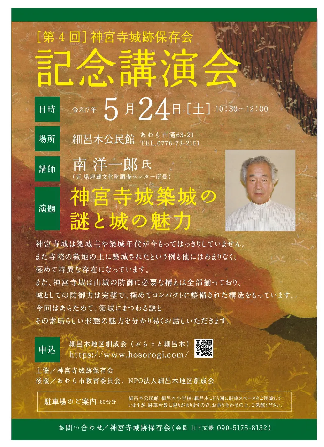 2024年5月24日(土)、あわら市の細呂木公民館において、神宮寺城に関する特別な講演会が開催されます。この講演では、元県埋蔵文化財調査センター所長の南洋一郎氏が、神宮寺城の築城の謎やその魅力について詳しくお話しします。神宮寺城はあわら市に存在し、指定文化財として、歴史的な価値が認められています。