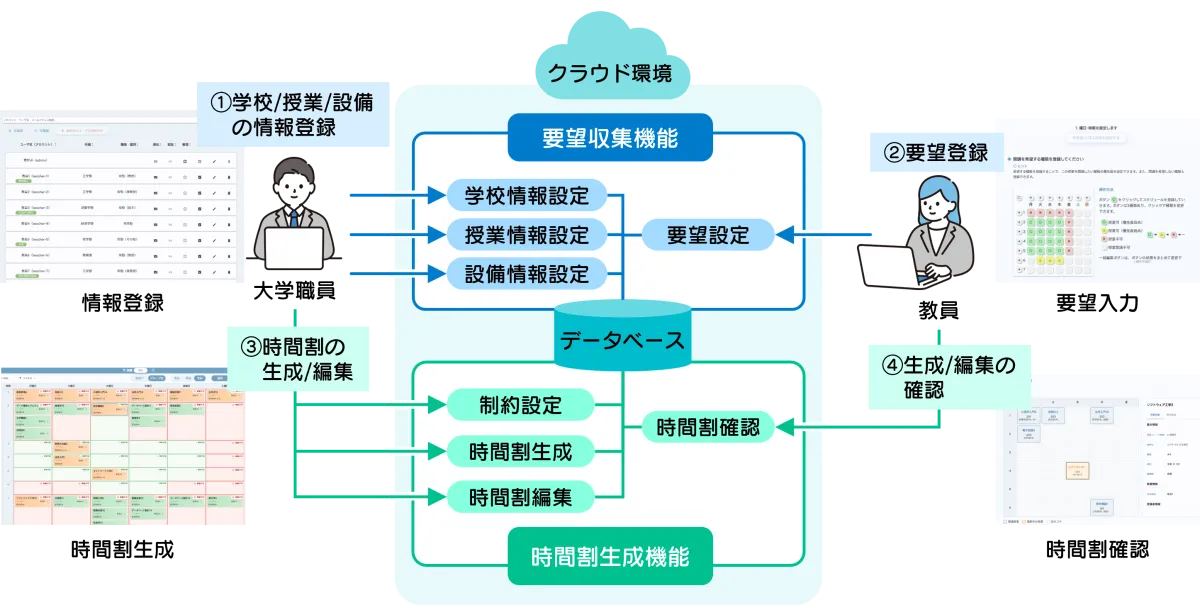 - - クラウドサービスの利便性: 各種情報を収集し、時間割を生成するプロセスがすべてクラウド上で一元管理され、インターネット環境があればすぐに利用できます。