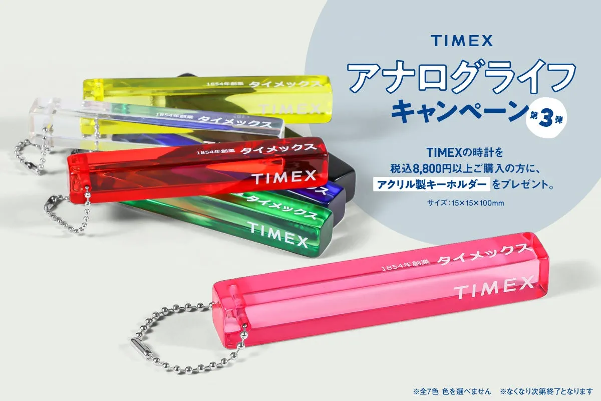 この限定キーホルダーは、全7色のカラーバリエーションで展開され、クリアなアクリル素材に「タイメックス」とカタカナで書かれたロゴが施されています。物理的な存在であるアナログの魅力を表現したこのキーホルダーは、触れた時の手触りや重みといった感覚が、「数値では測れない心地よさ」を思い起こさせます。