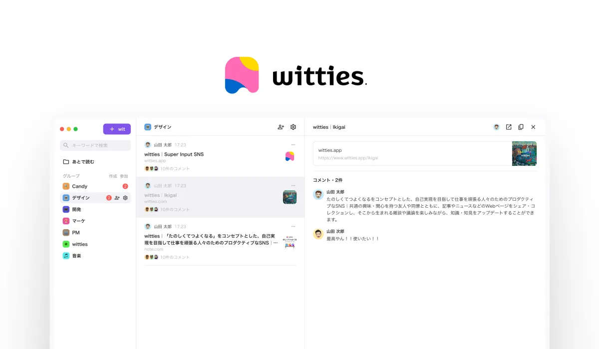 「witties」は、仕事で頑張る人たちが日々の学習や情報収集を、仲間と協力して行うことで、より楽しく、より効率的に進められるように設計されています。お気に入りのWebコンテンツを保存・整理し、それを起点に仲間と議論を交わしながら、共に成長していくことを目指す画期的なアプリです。