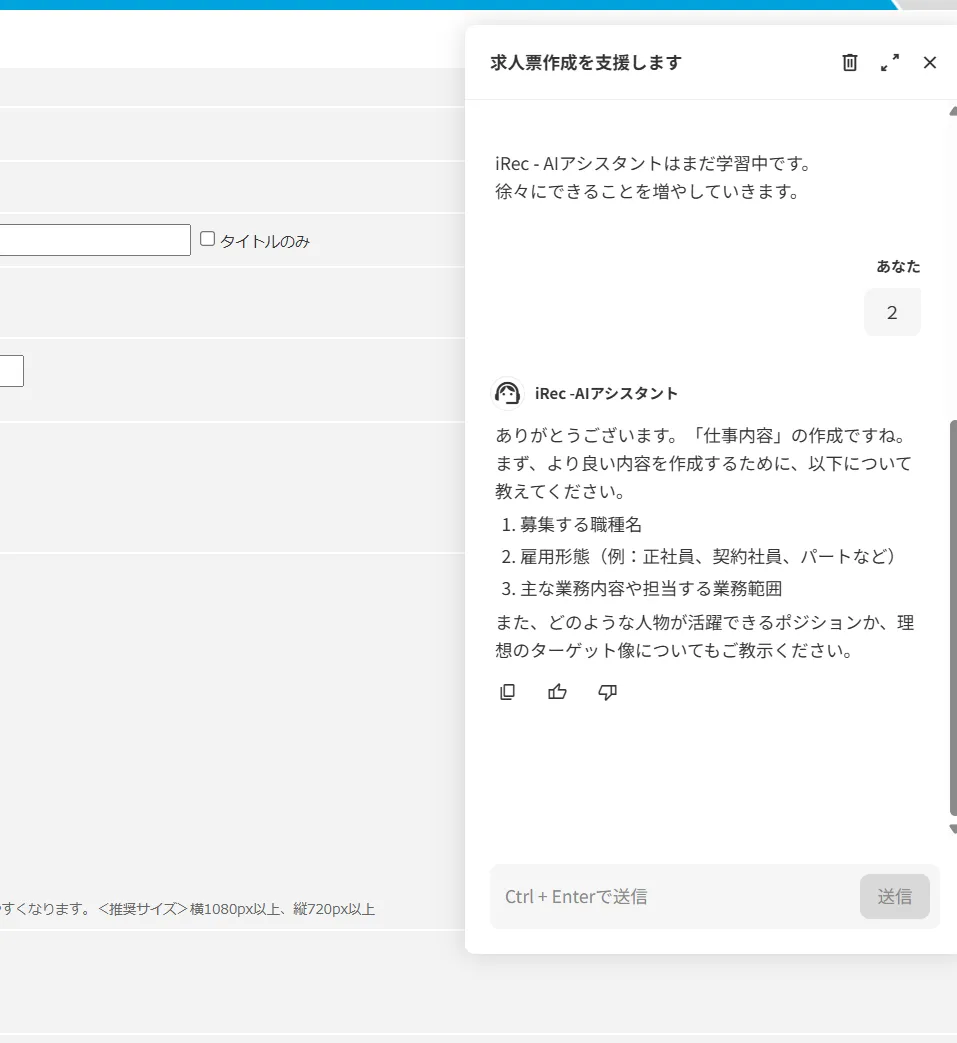 新たに導入されたAI求人作成機能では、iRecの募集要項編集画面にAIアシスタントが導入されます。このアシスタントに従って、企業や職種に関する情報を入力すると、応募者が魅力を感じるような「仕事内容」や「キャッチコピー」、さらには「アピールポイント」を自動で生成してくれます。作成された内容は、そのまま募集要項に反映できるため、手間が大幅に削減されるのが特徴です。