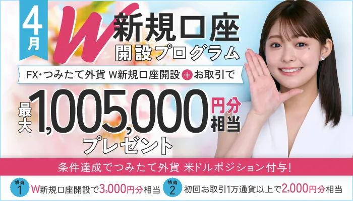新規口座開設特典 - 新規口座を開設すると、3,000円相当の米ドルポジションが付与されます。これは、FX取引と積立FXの両方を開設したお客さまが対象です。