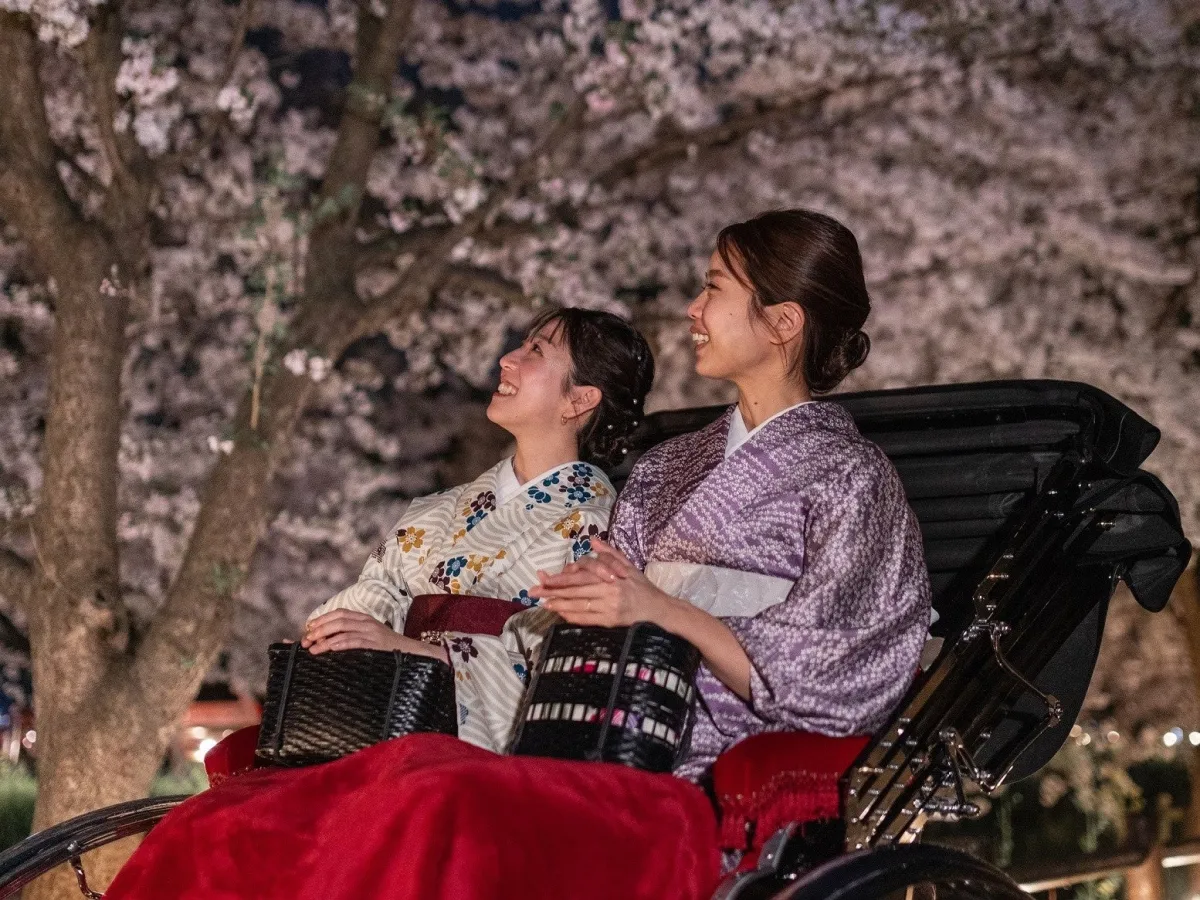 - ホテルの正面玄関から人力車がお客様をお迎えし、公園や名所を巡りながら夜桜を存分に楽しんで頂きます。