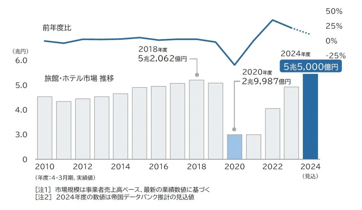 2024年度の国内旅館・ホテル業界は、事業者売上高が5.5兆円に達し、過去最高を記録すると見込まれています。これは、コロナ禍による厳しい時期を経て、再び活況を呈することを示しています。在宅勤務や行動制限の解除に伴い、訪日外国人観光客の増加と国内旅行支援策が追い風となったことが主な要因です。