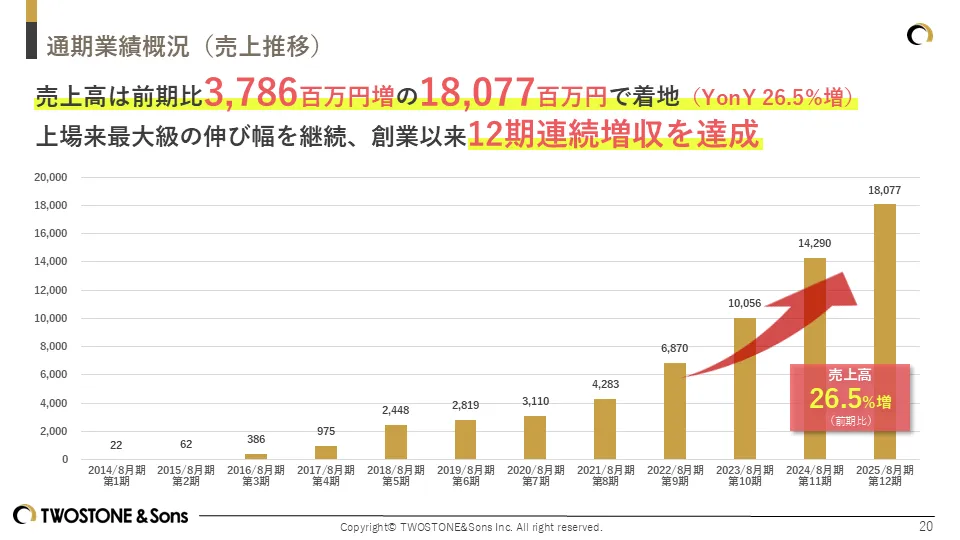 2025年10月15日、株式会社TWOSTONE&Sons(以下、当社)は2025年8月期の通期決算を発表しました。この決算では、売上高が18,077百万円に達し、前年同期比で3,786百万円、26.5%の増加を記録。売上及び売上総利益の両方が創業以来の最高値を更新したことが明らかになりました。