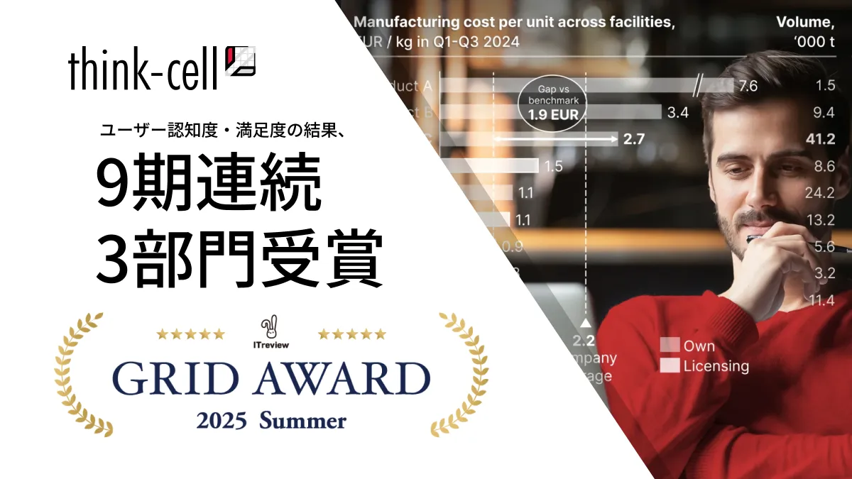 think-cell Japan株式会社が、アイティクラウド株式会社が主催する「ITreview Grid Award* 2025 Summer」で見事に3部門で受賞を果たしました。この快挙は、グラフ作成ツールやMicrosoft Office/Microsoft 365拡張機能部門で「Leader」、プレゼンテーション部門で「High Performer」の称号を得たことで達成されました。