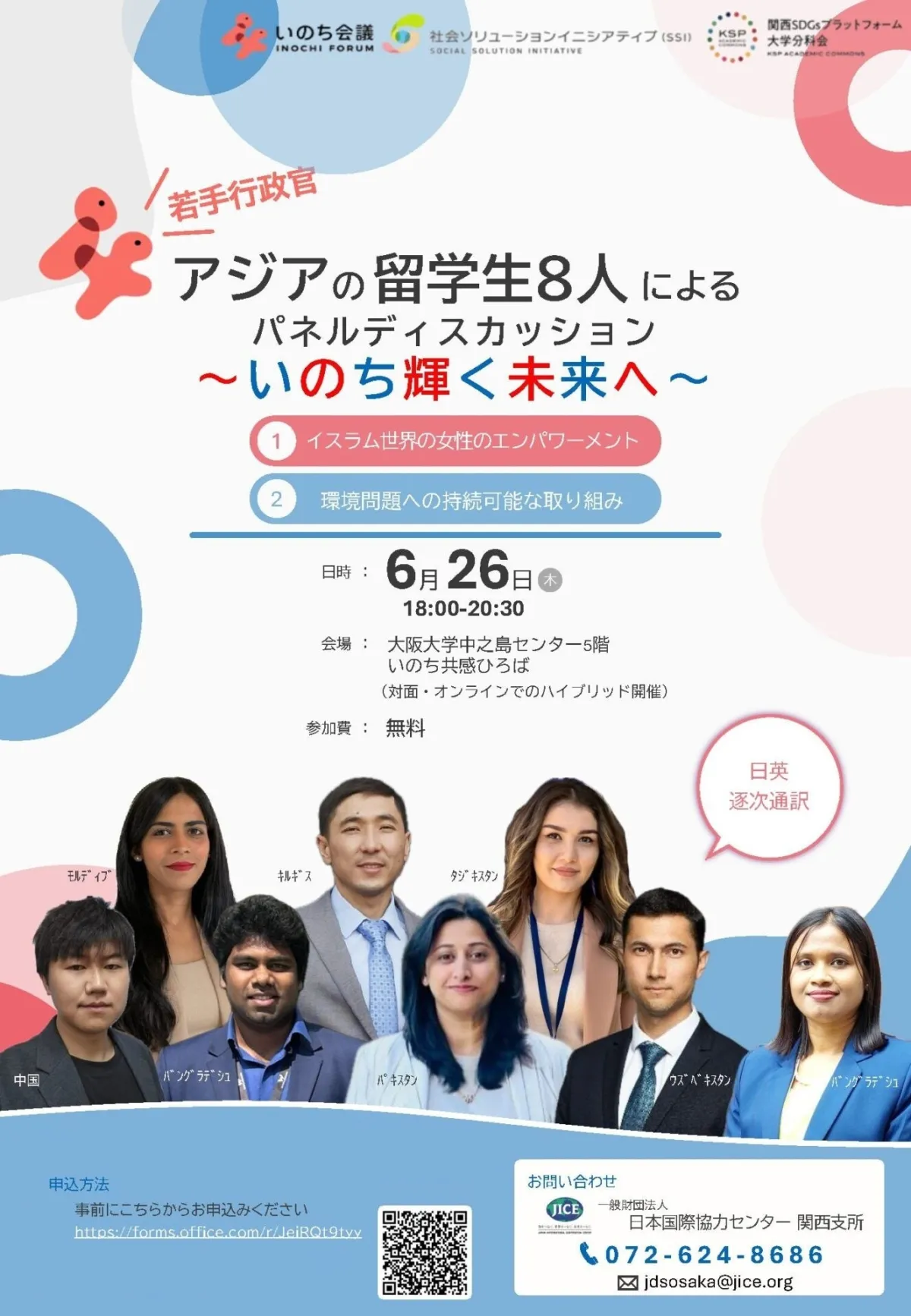 2025年6月26日(木)の午後6時より、大阪大学中之島センターで「いのちの輝く未来へ」パネルディスカッションが開催されます。このイベントでは、アジアの8カ国から来日した若手行政官の留学生たちが、自国や地域の課題について意見を交換し、未来の展望を語ります。