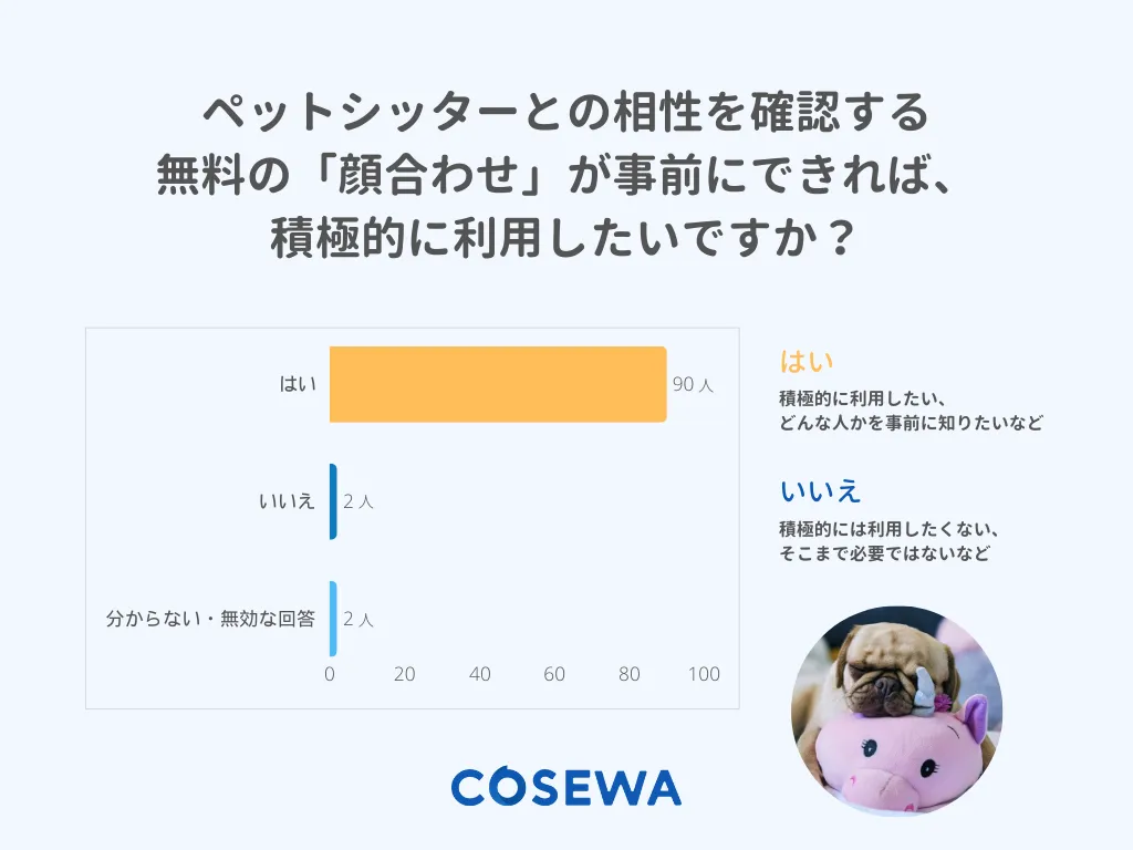 ペットを飼っている方にとって、ペットシッターとの関係構築は非常に大切です。Cosewaが実施した調査によると、ペットシッターを雇う際に「顔合わせ」を希望する飼い主が多いことがわかりました。この顔合わせは、何よりも安心と信頼を確保するための重要なステップといえます。