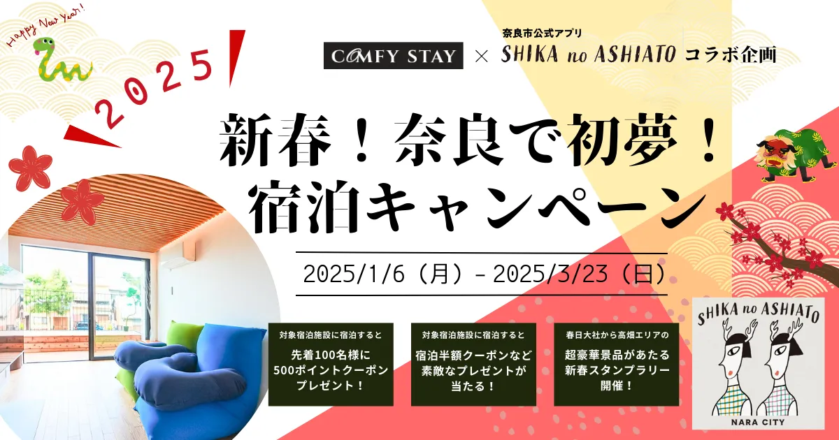 新たな年を迎えるにあたり、奈良市では「Comfy Stay」と奈良市公式アプリ「SHIKA no ASHIATO」が共同で「新春!奈良で初夢!宿泊キャンペーン」を実施します。このキャンペーンは、1月6日から3月23日までの期間中、19の宿泊施設の中から対象の宿泊所に泊まることで、多くの特典が受けられるという素晴らしい機会です。