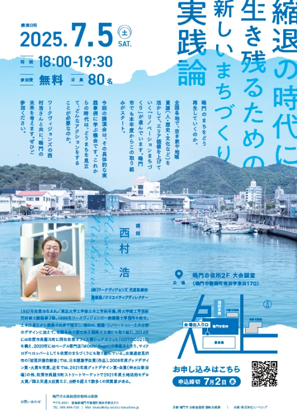 この講演会は、「リノベーションまちづくり」に関心がある方や鳴門市のまちづくりに参画したい方を対象としています。参加は無料で、定員は80名です。参加希望者は、以下のリンクから事前申込をお願いします。