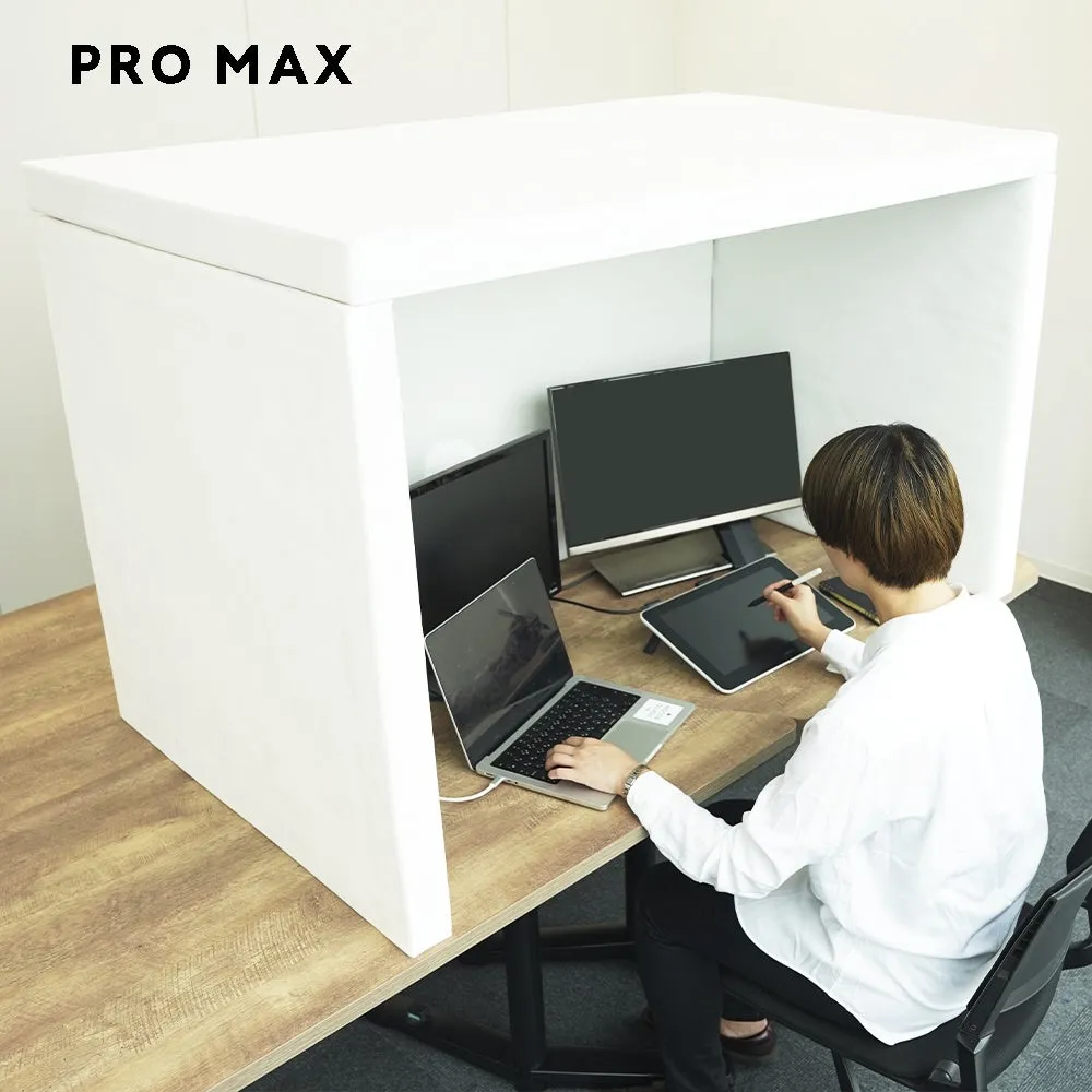 新商品「ホワイトキューオンOkudakePRO MAX」は、幅1400mm、高さ860mm、奥行き800mmの大型卓上防音ブースで、特に多くのディスプレイを使用される方に最適です。この新商品は、お客様の「もっと大きなサイズが欲しい」というリクエストに応えて開発されました。