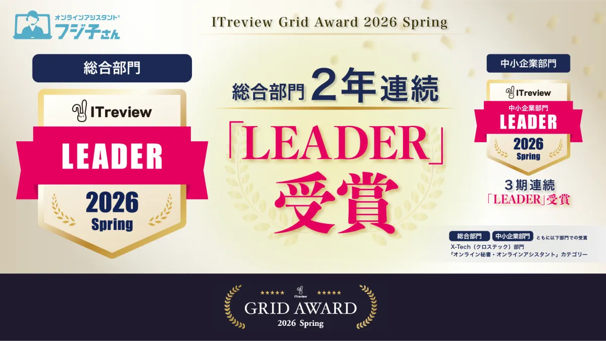 BPOテクノロジー株式会社が提供するオンラインアシスタント「フジ子さん」が、2026年の春に開催されたITreview Grid Awardにおいて、オンライン秘書・オンラインアシスタントカテゴリーで2部門ともに最高評価である「Leader」を獲得しました。この栄誉は、総合部門で2年連続、さらに中小企業部門でも3期連続の受賞ということで、業界内での信頼性と高評価を証明するものとなりました。