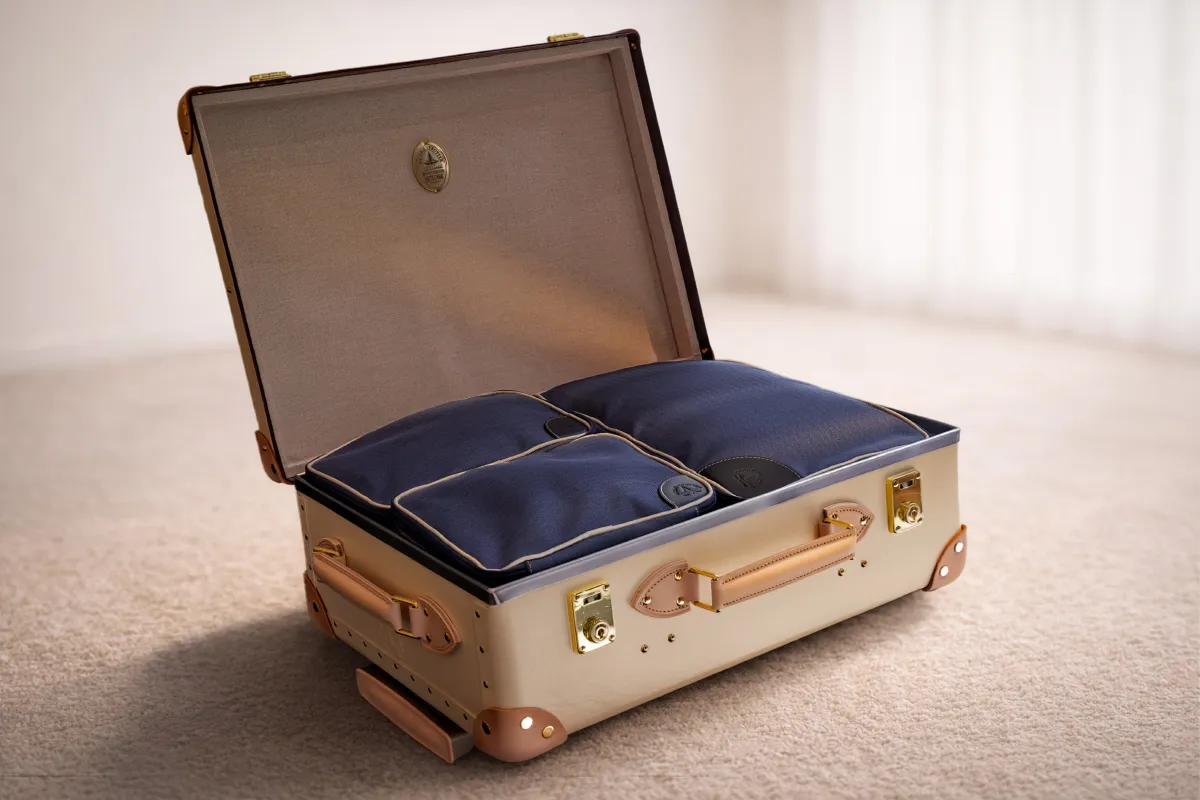 さらに、スーツケースを1点購入するか、合計20万円以上(税込)の購入をされたお客様には、グローブ・トロッターオリジナルのネイビーのパッキングキューブが贈呈されます。このパッキングキューブは、衛生管理や電子機器の収納に特化したデザインで、軽量かつコンパクトに保管できるのが魅力です。アイボリーのパイピングとステッチが施されたデザインは、旅行のクオリティを一層引き立てます。
