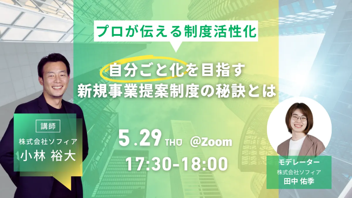 株式会社ソフィアが主催する無料のオンラインセミナーが、5月29日(木)17:30より開催されます。今回のテーマは、「自分ごと化を目指す新規事業提案制度の秘訣」です。このセミナーでは、企業が自社内で新規事業を創出するための手段として導入が増加している新規事業提案制度の活性化に焦点を当てています。