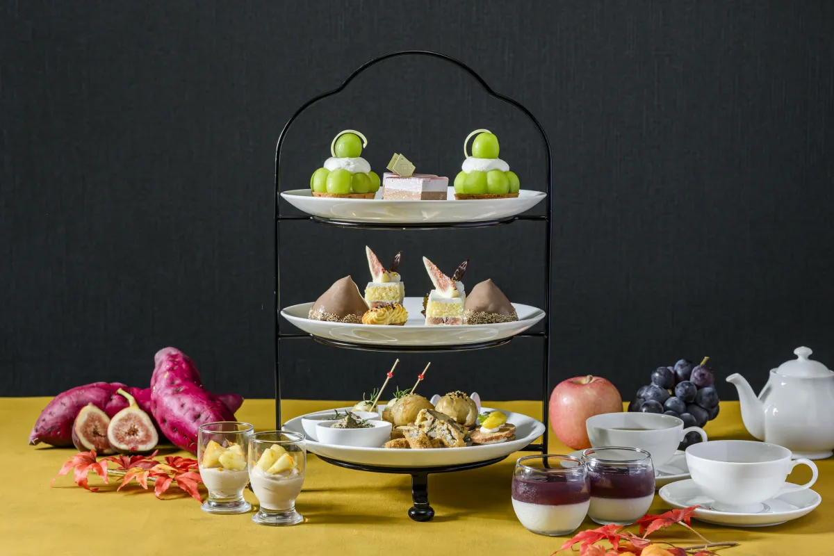 「金鼓」は、季節ごとの新鮮な素材をテーマにした、パティシエ山岸が手がける華やかなスイーツの数々が並びます。特に今年のテーマは“収穫祭”で、さつまいもや栗、無花果、シャインマスカットといった秋の味覚を贅沢に取り入れています。このアフタヌーンティーは、甘味と塩味のセイボリー料理のバランスが絶妙で、訪れる人々に秋を感じさせる特別な体験を提供します。
