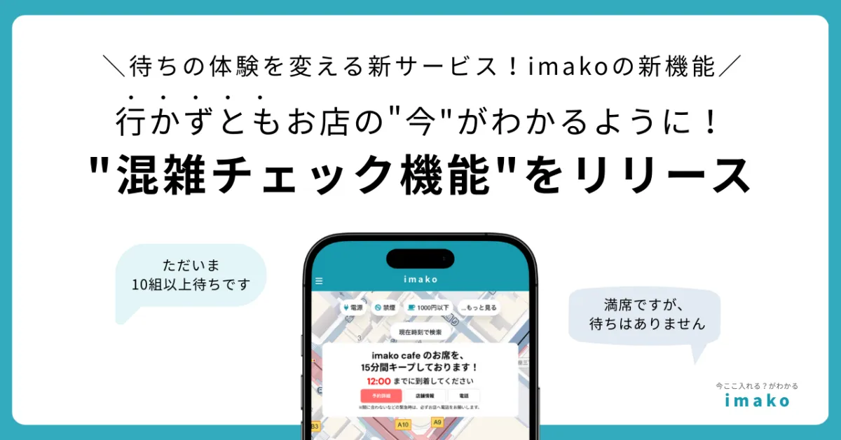 imakoが「直前席キープ」機能をリリースしたのは2025年11月ですが、その後多くのユーザーから「席が予約できなかったとき、お店の状況を知りたい」との声が寄せられました。これに応じて新たに「混雑チェック機能」追加されることとなりました。