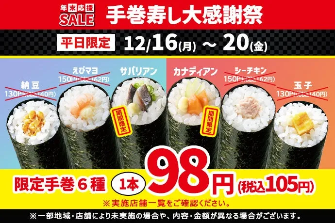 全国で人気の持ち帰り寿し店「小僧寿し」が、2024年12月16日から20日までの平日限定で、特別なセール「手巻寿し大感謝祭」を開催します。このキャンペーンでは、一般的に人気の高い手巻寿し6種類が、驚きの価格98円(税込105円)でご提供されるということです。