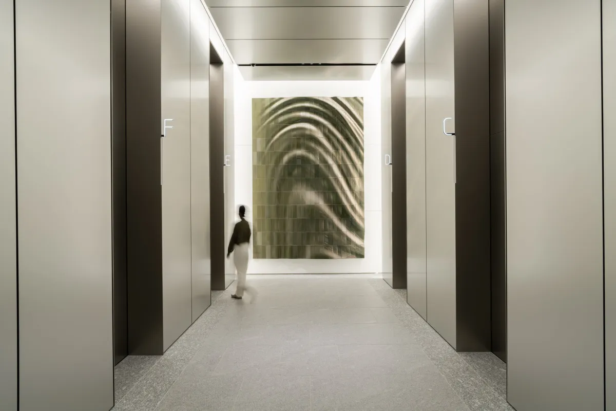 設置場所である麹町弘済ビルディングは、四季折々の植栽による美しい風景が特徴です。積彩は、その自然観をエレベーターホールに取り込むことで、室内にいても外の風景や季節の移り変わりが感じられるような空間を作り出しました。ビルの位置する場所は、新宿通りのカーブ交差点であり、地域のエネルギーが集まる地点でもあります。この作品のフォルムは、訪れる人々の動きや街の流れを可視化しており、緩やかな曲線と曲面の重なりが美しいハーモニーを生み出しています。