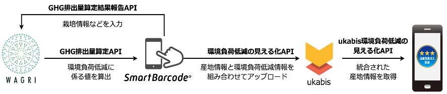 このプロジェクトは、農産物の環境負荷低減に向けたデータ連携を行うための実証実験です。農業者が使用するのは、SmartBarcodeというシステムで、これにより栽培情報などを投入します。そのデータは、農業データ連携基盤「WAGRI」と結びつき、温室効果ガスの排出量を算定するAPIを通じて、環境に対する貢献度が測定されます。